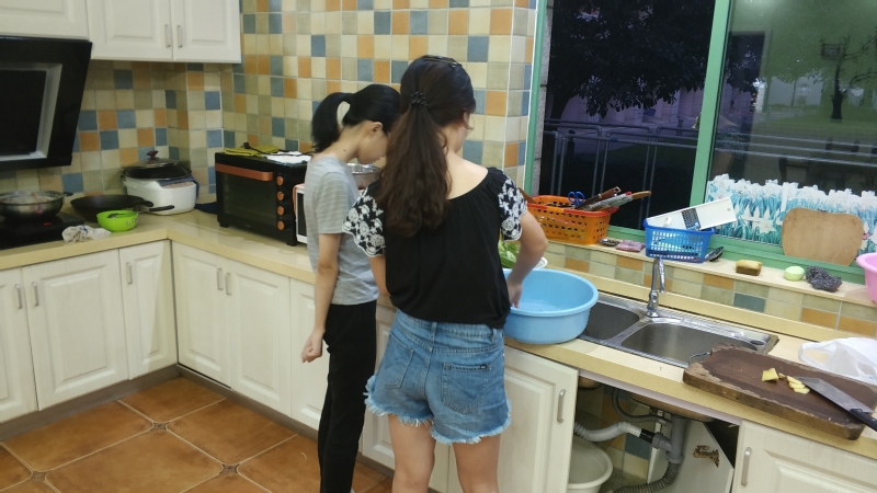 抵达日租房后,大家有说有笑的开始准备食材,进行火锅前的“洗刷刷”。在“洗刷刷”过程中也分工明确,一部分负责切菜、清洗蔬菜;一部分将屋内物品进行整理,将电磁炉置位并将蔬菜摆盘放置好以便于涮,同学们在这个过程中也不忘互相调侃,气氛一片大好。