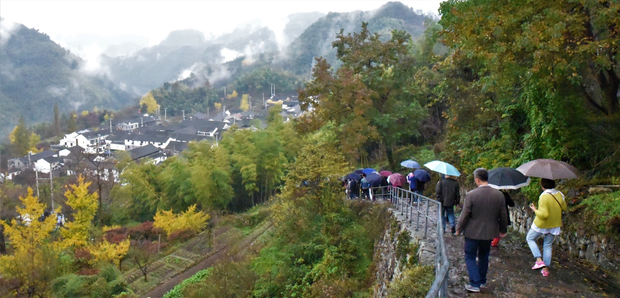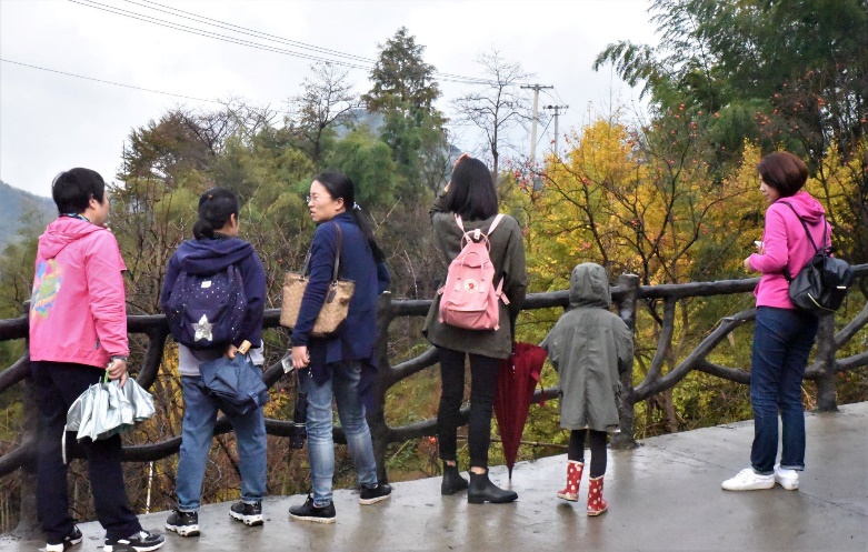 在短暂休憩后,大家兴致盎然地来到了丹山赤水风景区。景区所在的柿林村,四面环山,满坡翠竹林木,流泉叮咚,鸟语花香,不但山水秀丽,而且原始古朴,山居原貌保持完好。稀疏的秋雨无法浇灭老师们游玩的热情,大家远眺美景,醉心于美丽的自然风光之中。