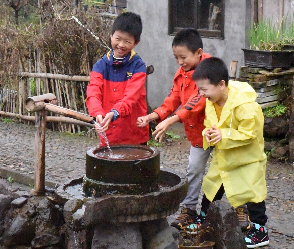 图注:美丽的柿林村,远眺美景的老师们与开心玩乐的小朋友