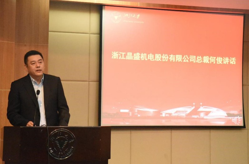 随后,浙江晶盛机电股份有限公司总裁何俊先生发表讲话。何先生代表晶盛向本次获奖学生表示祝贺。接着,他详述了企业的发展历程、研发平台和发展规划,何俊先生作为优秀浙大校友,表示期待更多浙大优秀的学弟学妹能够加入晶盛,企业也会全力创造良好的职业发展环境,成为浙大机械毕业生的优质雇主。