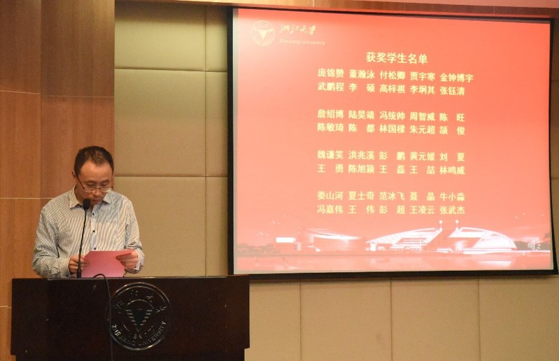 在颁奖环节,晶盛机电有限公司总裁何俊、副总裁朱亮、杭州中为广电技术有限公司总经理叶欣、浙江大学机械工程学院副院长刘振宇老师共同为获奖学生颁奖。
