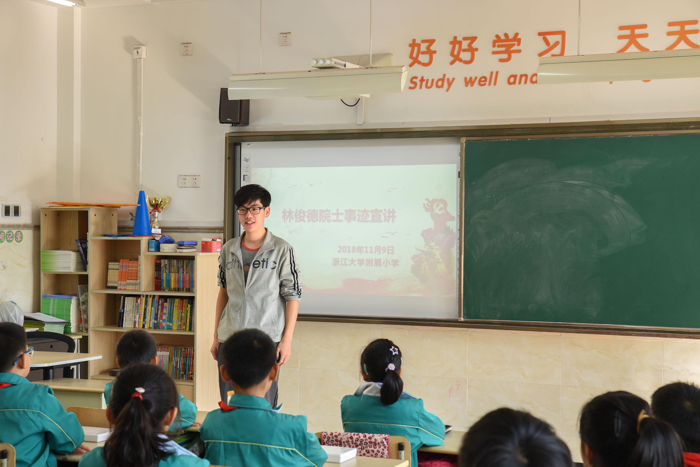 2018年11月9日下午,浙江大学马兰工作室在浙江大学附属小学开展了首次“马兰精神进小学活动”。本次活动由机械工程学院辅导员李杨宁老师带领,本科学生张博伦作为主讲人,在浙大附小四年级(5)班给孩子们上了一堂关于林俊德院士先进事迹的讲解思政课。