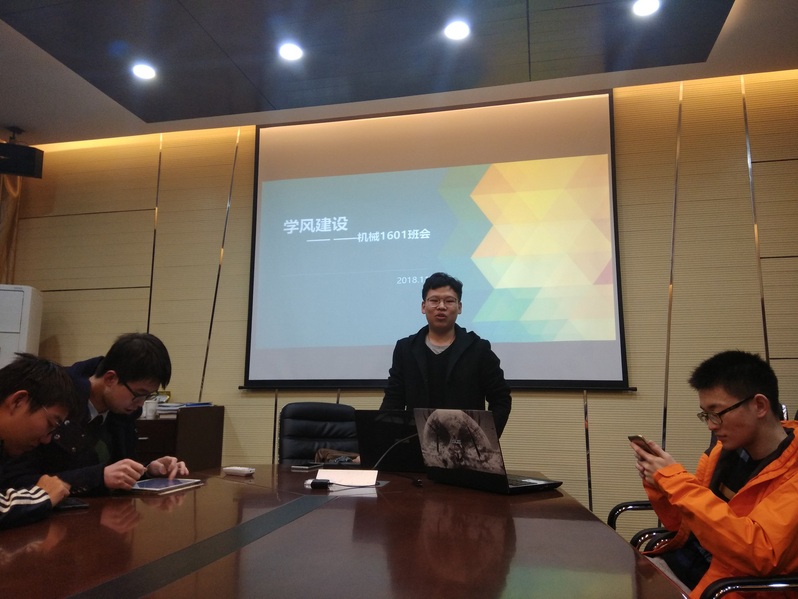 机械工程1601班的班长戴陵阳同学主持了本次班会。戴陵阳同学主要通过上课情况、寝室情况,学习经验与资料分享等三个方面有针对性地提出了我们班上所面临的问题以及建议。