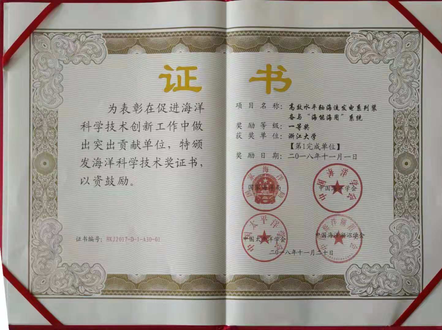 近日,中国海洋学会科学技术奖颁奖仪式在广西北海第九届海洋强国论坛开幕式上举行。浙江大学机械工程学院李伟教授团队的“高效水平轴海流发电系列装备与‘海能海用’系统”项目荣获中国海洋科学技术奖一等奖。该奖项由国家海洋局、中国海洋学会、中国太平洋学会、中国海洋湖沼学会联合颁发,旨在表彰对促进海洋科学技术创新工作中做出突出贡献的单位。