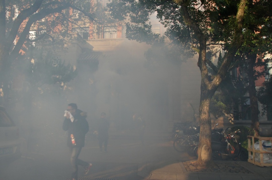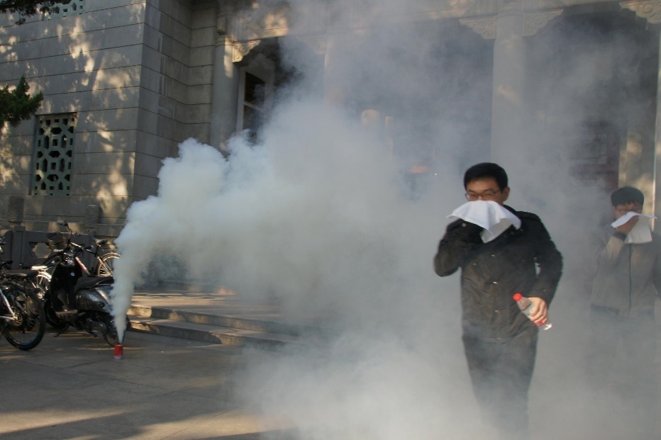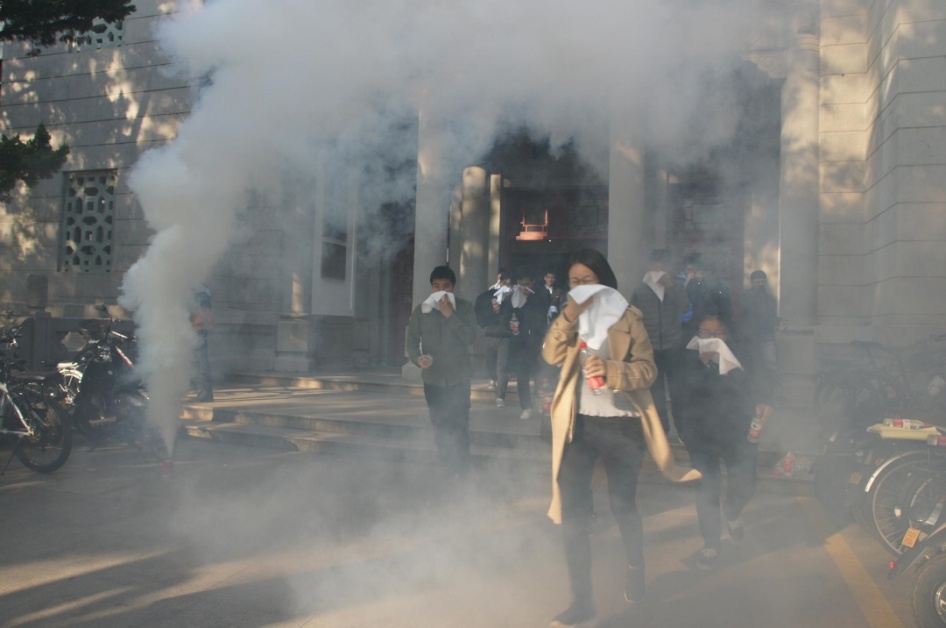从模拟火警点教一撤离后,参与演习的人员在安全集合点——教三与教四之间的空旷走道集合,聆听保卫办陈忠云主任对撤离演习的总结。陈主任针对火灾现场的撤离强调了两点:第一,捂住口鼻的毛巾需要折叠四到八层,一定要用水打湿之后再使用,以便于烟雾、火场空气中的有毒物质被溶解吸收在毛巾中;第二,撤离火场大楼时一定要弓身躲避烟雾,并顺着墙壁走,避免在有浓烟的火场中迷失方向和发生踩踏事故。