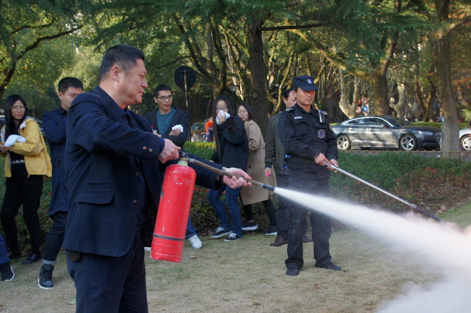 总结完撤离演习之后,陈主任给参与演习人员现场讲解演示了如何使用干粉灭火器灭火,并鼓励所有人都借此机会实际使用一下干粉灭火器。老师同学们纷纷在指导下拔开灭火器的保险栓,站在上风口,对准火源根部按下灭火器手柄,使之喷出干粉熄灭模拟火源,每个人都获得了使用灭火器的真实体验。