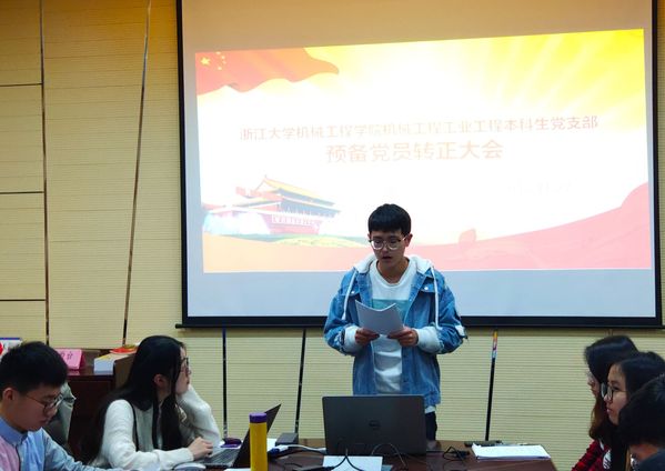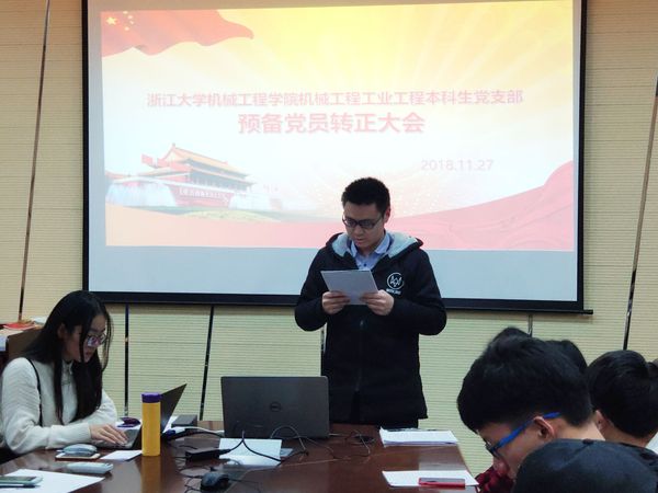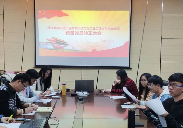 2018年11月27日晚7点,机械工程学院机械工程、工业工程本科生党支部全体党员在玉泉校区教一411会议室召开了党员大会,集体审议、讨论和表决陈欣玥、冯统帅、茹喆曦、刘雅聪、宋伯原、朱皖东、余天浩和谢佳尧八位同志的转正问题。团委辅导员、支部书记李杨宁老师出席了会议。浙江大学机械工程、工业工程党支部共有25人,实到24人,正式党员6人,实到5人,达到应到三分之二的要求,可以开会。