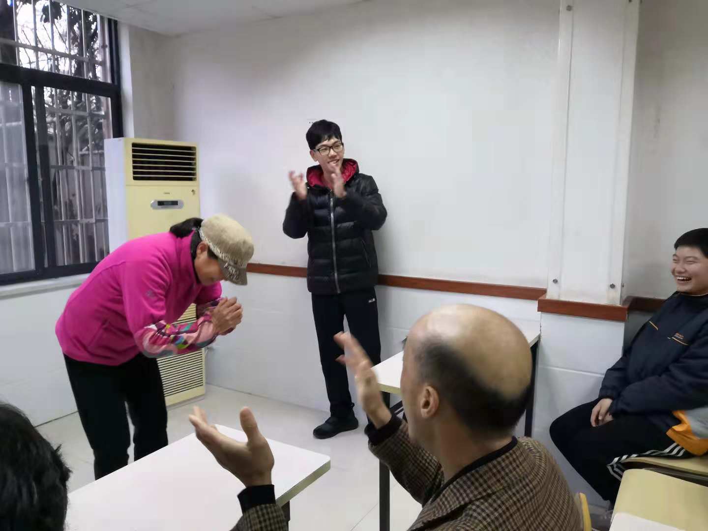 在主持人张博伦同学简单的热场介绍比赛规则之后之后,工疗员们就开启了一场你来比划我来猜的童趣之旅。负责人罗老师为工疗员们准备了糖果,每个回答对问题的人都得到一颗糖果,这充分激发了大家参与的热情。比赛先由志愿者们进行比划,但是工疗员们的热情参与还是超过了我们的期待,因此随后工疗员们也参与进了比划的队伍。