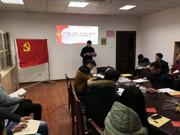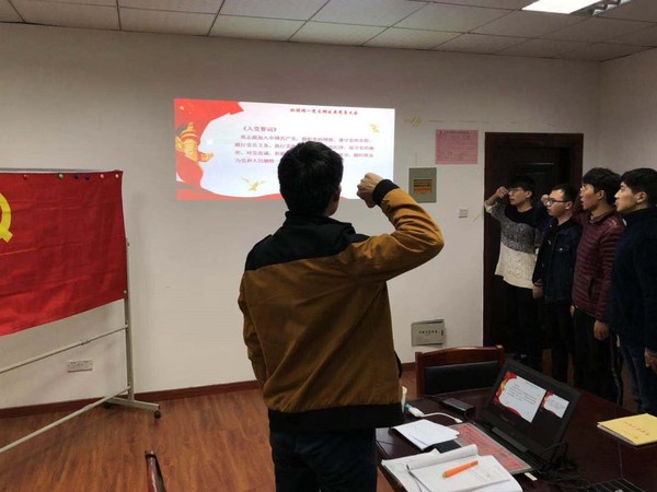 首先四位同志逐一进行《入党志愿书》的宣读,结合自身个人事迹与体会,重温了自己入党的初衷,表达了坚定不移跟党走的决心。期间与会的党员同志们仔细聆听,认真做好相关的记录。之后,戚昱宸、龙威的入党介绍人王永宏同志以及傅奎、詹文超的入党介绍人周城皓同志分别介绍了发展对象半年多以来的情况。随后支部委员会向支部大会汇报了对四位同志的审议情况,认为他们符合入党要求。接着与会党员就四位同志的日常生活、学习、思想情况谈了谈自己的看法并充分发表各自意见。讨论后拥有表决权的党员对是否赞成四位同志入党进行投票,此次投票采取不记名的方式,最终四位同志均全票通过。最后,四位同志面对党旗,庄严宣誓,决心以后用更严格的标准要求自己,为同学服务,做学生表率,为共产主义事业奋斗终身。