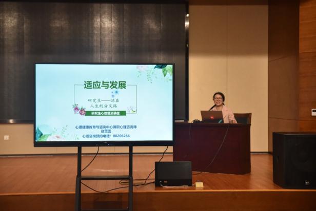 首先进行的是心理健康讲座,项老师发表引言,她表达了学院对校外科研同学们的关心,希望帮助同学们更好统筹规划科研与生活,服务大家的健康成长。随后,赵蕾蕾老师为在场的同学们带来了一场针对性的心理讲座,分析了研究生阶段可能遇到的心理问题及其原因开始,论述了研究生心理成长与发展的关键,提出了判断心理健康的一些标准,比如有充分的安全感、充分了解自己、生活目标和理想切合实际等,帮助同学们深刻认识自己的心理状态,呼吁大家能够关注和舒缓压力过度,呵护自我和身边的人的心理健康。
