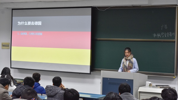 之后李一曼学姐,为我们带来了德国留学的新知识。不同于美国的大学体制和不同的录取流程,丰富了同学们出国之路和准备的可能性。李学姐学习德语准备简历的过程,更是鼓励同学们以热情和努力投入到对人生目标的追求中去。