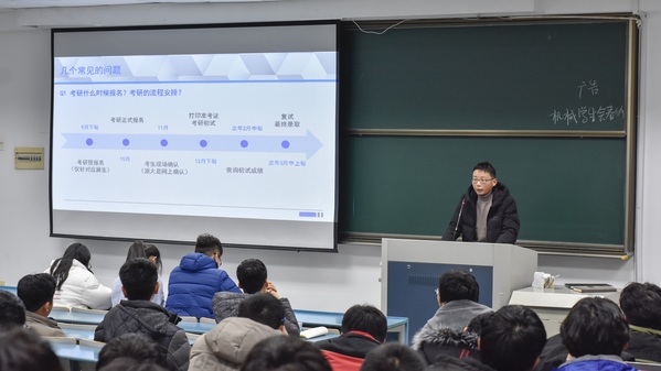 在此之后朱可学长和崔金浩学姐,分别介绍了本专业考研和跨专业考研的过程。一方面学长们教导我们考研之路平坦,我们要静心学习、劳逸结合、注重基础和平时积累,另一方面在考研中要注意选择和信息了解,避免不必要的无用功和时间浪费。