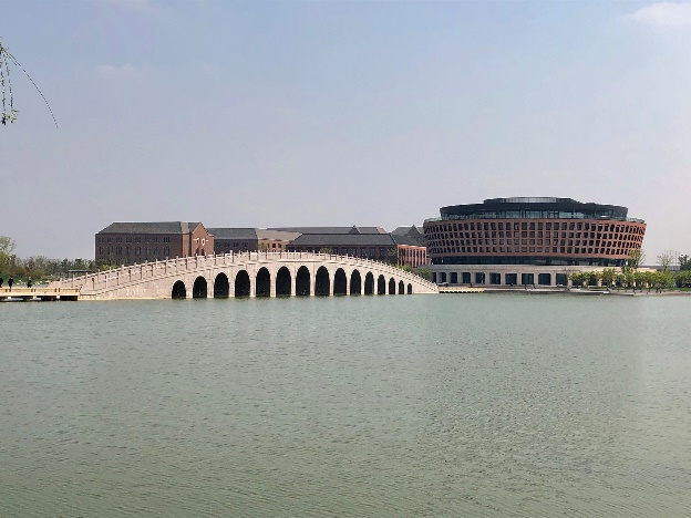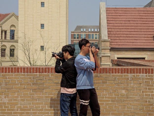 随后以机械视点成员为主的专业摄影教学团队便带领随行同学在美丽的海宁校区内进行踩点拍照。他们依次在教学楼,图书馆,食堂观景平台和湖心桥等处进行现场摄影教学,机械视点副主任薛星宇指导同学们如何取景,如何构图,才会使得画面会更加具有美感。他告诉同学们最简单的构图手法就是对称构图,拍摄圆形大讲堂的时候,可以以桥为中轴线,大礼堂置于画面中央位置,这样拍出来的照片自然就具有一种对称美。