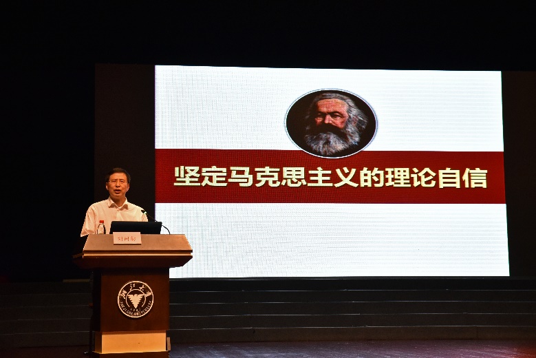 报告会在庄严的国歌声中拉开了帷幕。刘同舫教授作了主题为 “坚定马克思主义的理论自信”的报告。刘教授选取了不同性别、文化背景、国家的思想家和哲学家,以他们对伟大思想家马克思的评价作为切入点,详细介绍了马克思被誉为“千年第一思想家”的原因,以及马克思主义的丰富思想内涵。