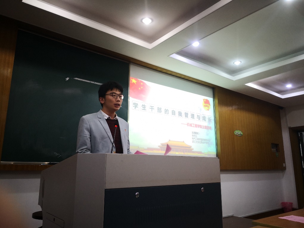 为进一步加强学生干部的自我能力管理意识,培养学生干部的责任心,2019年4月15日晚上,机械工程学院团委举行了以“学生干部自我管理与成长”为主题的团课,特邀电气工程学院团委副书记李济沅老师主讲。机械工程学院团委书记王芳官老师、团委副书记李杨宁老师、辅导员金霞娟老师,以及机械工程学院全体团学干部、党支部书记和学院青马工程第11期学员等共近100人参加了本次团课。活动由李杨宁老师主持。