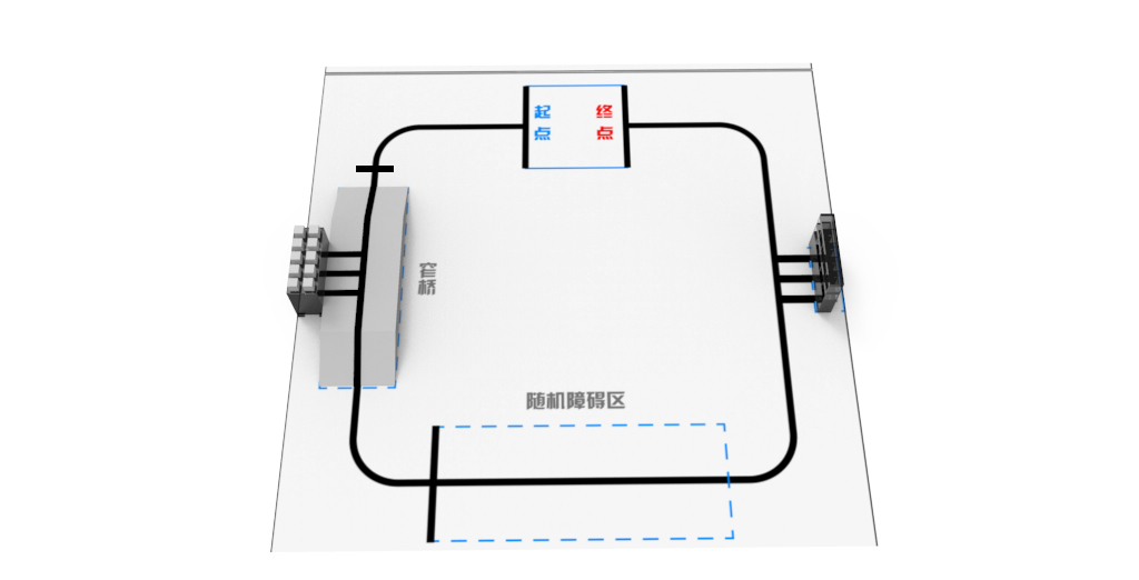 (2)关于场地:比赛场地表面布置有黑色引导线连接、随机障碍等,构成完整的赛道。同时,赛道设置了小车的起点、上料区、下料区、随机障碍区和终点,如图所示。赛道最终方案赛前由组委会统一公布为准,正式比赛时的比赛场地或因加工装配等原因会有±1cm的误差,参赛队伍必须适应承办方提供的比赛场地和物料。