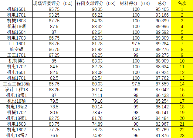 为组织和引导广大团员青年深入学习贯彻党的十九大精神和习近平新时代中国特色社会主义思想、2018年全国“两会”精神,学习贯彻学校第十四次党代会精神,加强团的基层组织建设,不断增强基层团组织的凝聚力、创造力、战斗力和活力,机械工程学院团委开展了 “机械工程学院2018-2019学年第二期团日活动答辩”,经过材料评分和现场(包括评委和观众)评分,得到各参与答辩团支部总分和排名(详见附件)。