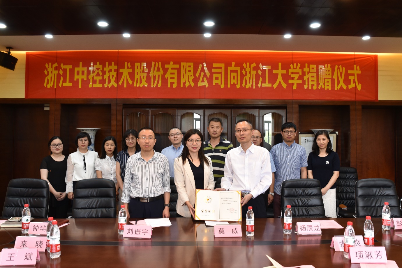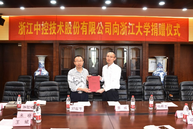 首先,浙江中控技术股份有限公司副总裁莫威先生及浙江大学机械工程学院刘振宇教授代表双方进行了现场签约。刘院长向对方赠送了学校基金会颁发的捐赠证书。