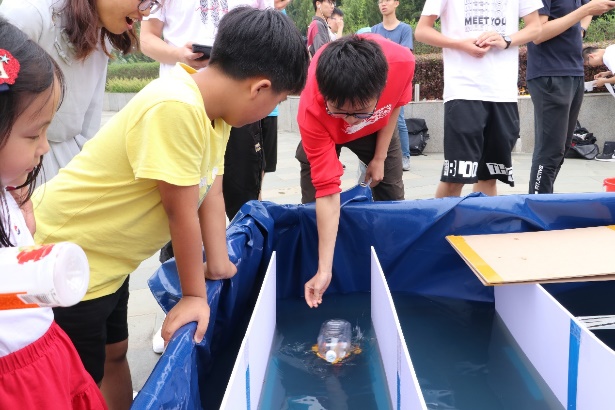 下午1点30分,万众期待的水上机器人竞速环节正式打响!一艘艘设计精美、动力十足的“舰艇”依次下水,有的扬风起航,势不可挡;有的控制精准,畅游无阻;有的美中不足,卡在赛道处。面对这些花式多样的前行方式,观众们乐不可支,参赛和观赛的兴致更是高涨。尤其活动当天是儿童节,引来很多儿童的围观,小朋友的加油欢呼声也一度引得现场捧腹连连。