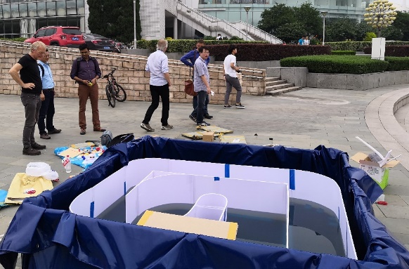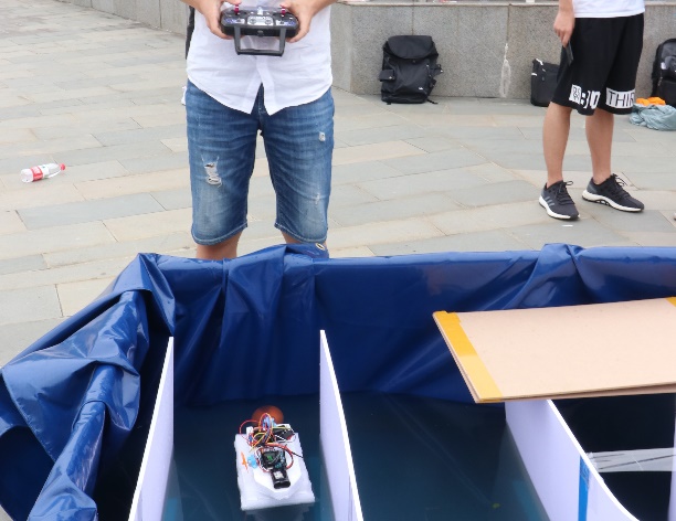 活动当天,赛道早早地开放给同学们调试。巧妙的机械结构,精准的远程遥控,每一艘船都是设计者们智慧的结晶。参赛同学们细心地调试自己的水上机器人,脸上洋溢着自信的笑容,我们相信接下来一定是一场激烈而又紧张的比拼。结束调试的队伍将作品放在展台上展示,引来浙大学生及外国友人前来驻足交流。