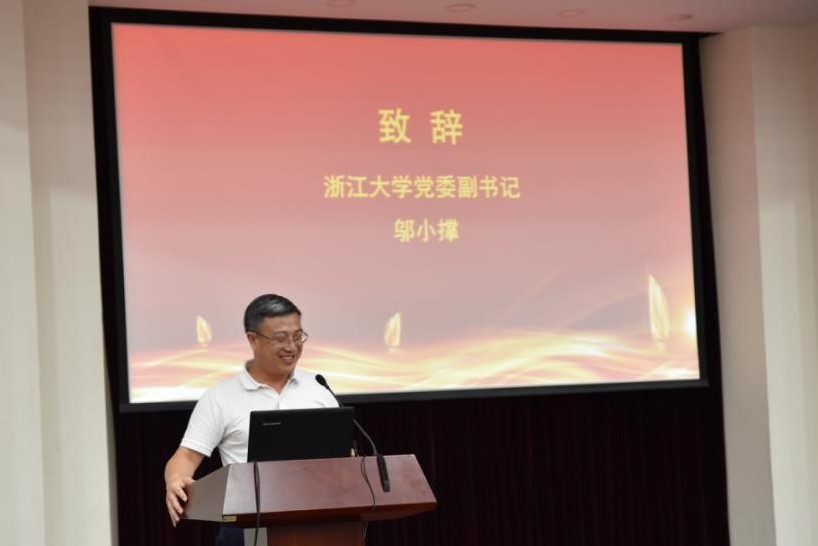 首先,浙江大学党委副书记邬小撑致辞。他借用“繁霜尽是心头血,洒向千峰秋叶丹”诗句来勉励学子们学习倪良正先生忠于国家忠于人民之坚守,用科学理念和人文情怀去创新探索人生道路之精神。邬小撑用“忠”“善”“泽”“基”“集”五个字来概括倪良正先生之风骨,衷心赞扬了他作为浙商引领者之一,用自己成功经验和匠人精神去教导后人的高尚品质。最后他代表浙江大学对王永昌主任和倪良正董事长表示衷心感谢。