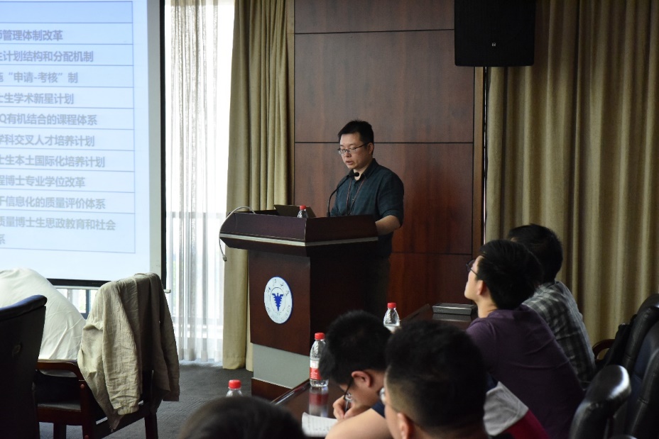 首先,研究生院党支部第二党小组成员、研究生招生处副处长王征老师就博士生教育综合改革向与会同志进行了介绍并与学生支部进行热烈的讨论。王征老师从中世纪的博士生培养历史出发,带领大家学习了浙江大学博士研究生教育的现状、浙江大学人才培养的使命与责任。作为教育部综合改革试点之一,浙江大学就招生选拔、科教融合、思政教育等三个方面提出了十点改革举措,最后王老师简要介绍了预期成果。