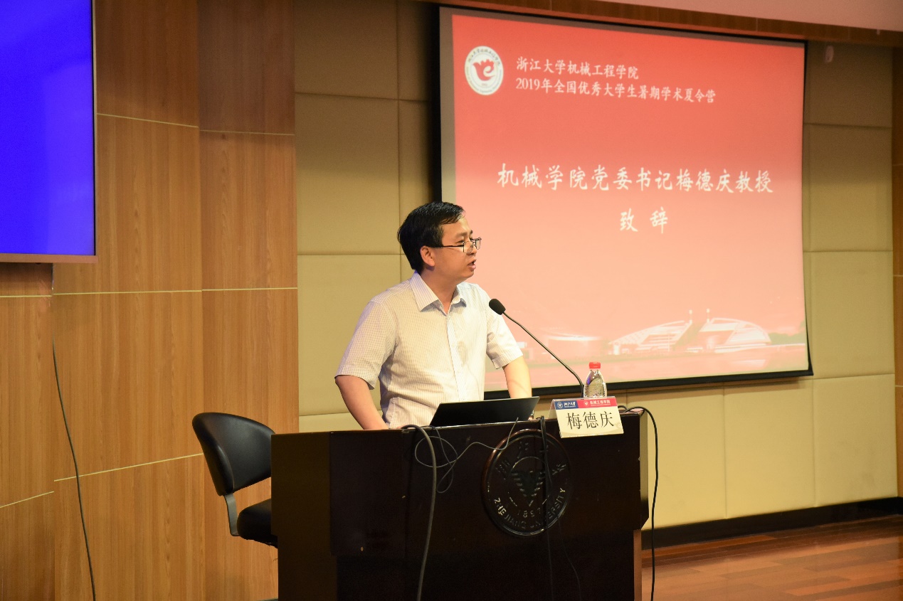 梅德庆书记在致辞中对参加本次学术夏令营的同学们表示了热烈欢迎和衷心祝贺,并从历史沿革、学科实力、师资实力、科研实力及学科平台等方面详细介绍了机械学院的现状和近年来取得的代表性成果。浙大机械,以其雄厚的底蕴和澎湃的活力在科研道路上披荆斩棘,勇攀高峰。作为互联网之城的杭州正大步迈进新时代,梅德庆书记以2022年杭州亚运会为契机,诚邀优秀的同学们来到杭州,来到浙大,共同书写杭州与浙大的新篇章。最后他祝愿营员们能在夏令营期间愉快地交流,并有所收获。