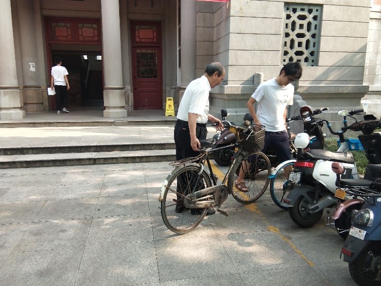 图注:蒋老师坚持骑自行车来学校参加支部活动