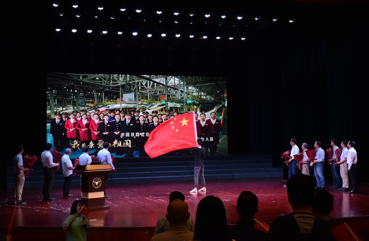 颁奖仪式接近尾声,伴随着舞动的国旗、嘹亮的歌声,全场师生一起深情唱响《我和我的祖国》,用歌声表达对祖国浓浓的爱和满满的祝福!祝福即将迎来70华诞的祖国繁荣昌盛。