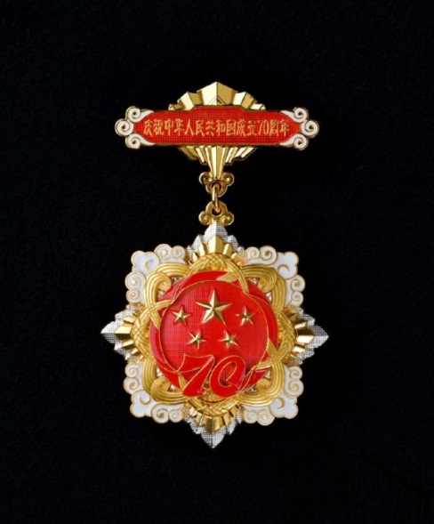 纪念章使用铜胎镀金材质,通径50毫米,主要元素为五星、“70”飘带、团锦结、如意祥云和光芒,主色调为红色和金色。核心部分为五星,代表国家荣誉。“70”飘带象征中华人民共和国70年奋斗历程。团锦结环绕在五星和“70”飘带周围,寓意全国各族人民大团结,构建人类命运共同体的愿景。章体外环以如意祥云、光芒构成,象征人民对美好生活的向往,同时表达了70年辉煌奋斗成就的基础上不忘初心、继续前进的坚定决心。