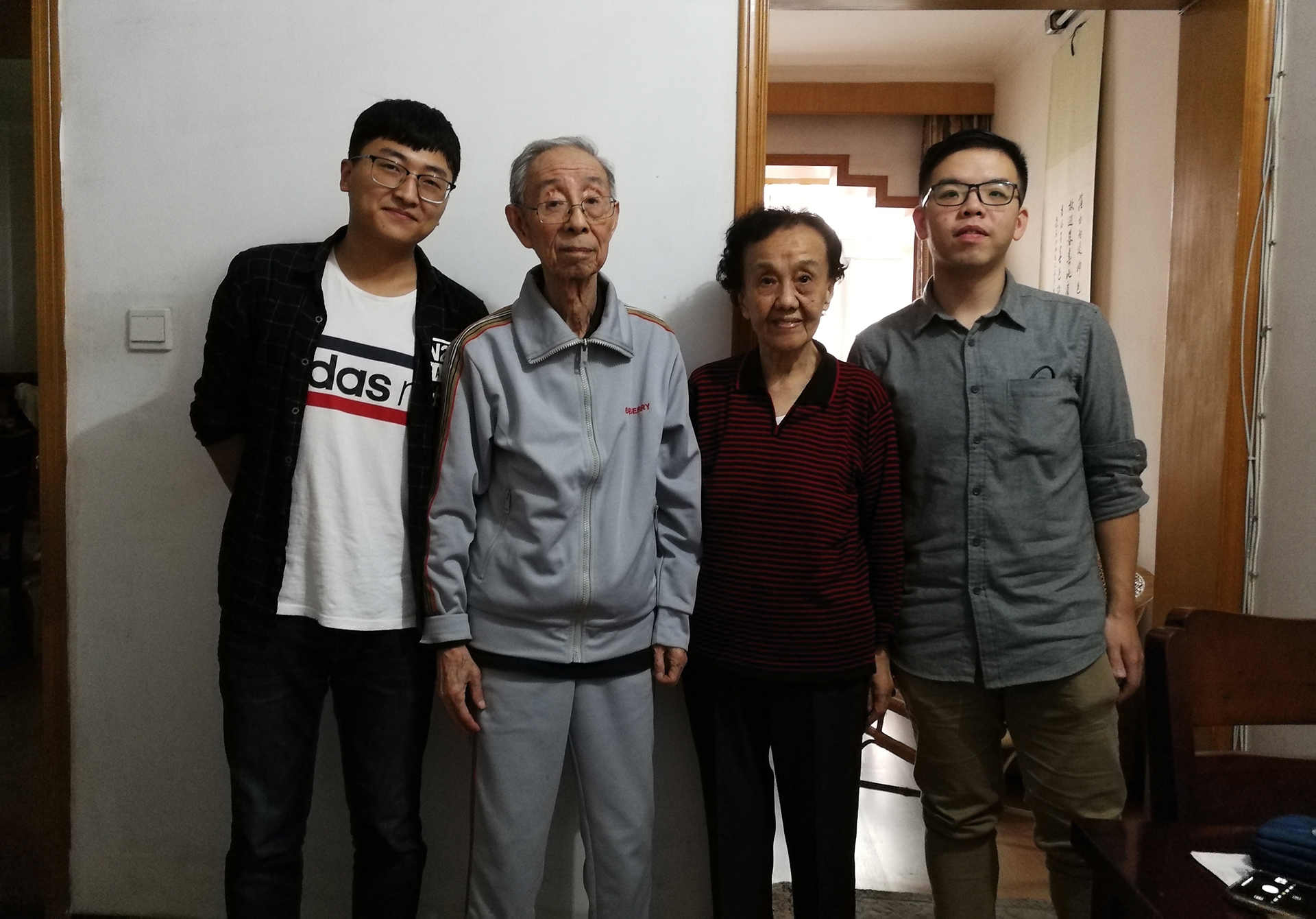 最后,我们和陆老师、王老师合影留念。此次探望活动让我们看到了浙大退休教师的风采,两位老师的子女也是浙大的老师,这就是真正的“挖井人”,学校、学院的建设就是在无数像他们这样的老师一步步奠基的,我们每一位在校的学生、老师都应该向他们致敬,同时也要向他们学习,发扬他们的奉献精神,为学校的发展献出自己的力量。
