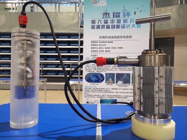 由机械工程学院吴世军老师、杨灿军老师指导,谢可人、阮永蔚、洪元东、周璞哲同学的作品深海热液温差能发电系统获得全国一等奖。该装置可以将高温热液和低温海水之间的温差能转变为电能,供深海机电装备利用,并且选择在热液区一次布放多种多个温差发电器,提高了发电效率。