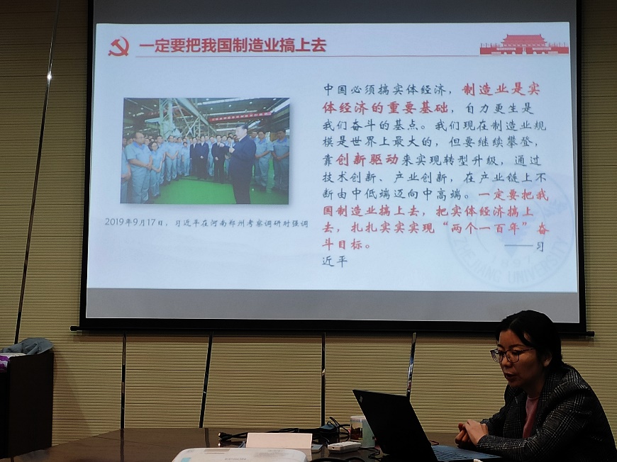 会上,项老师以“铸魂育人,培育家国情怀”为主题,为大家讲解了一堂生动的“微党课”。以林俊德校友为代表的一代代浙大人“愿做惊天动地事,甘当隐姓埋名人”,动人的故事讲到了每一位党员的心里。在谈到“中国智造,任重道远”时,大家结合自己的科研课题,讨论了行业内的“卡脖子技术”。在就业选择的研讨会中,大家各抒己见,纷纷建言献策,表示要立足机械,创新发展,勇于到国防军工单位以及西部、基层施展才华。