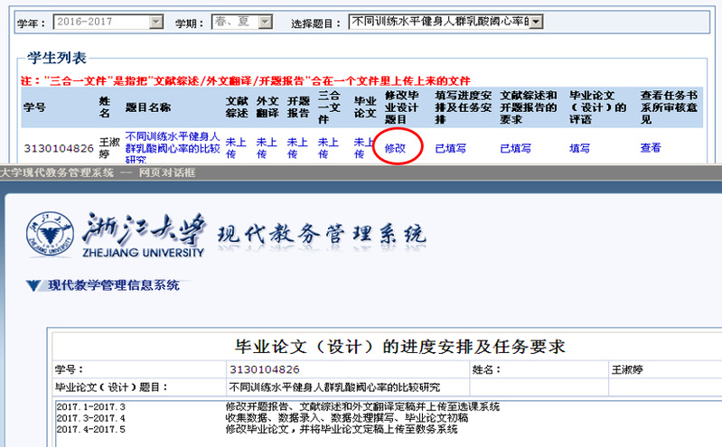 各位2016级本科生毕业设计指导教师: 如您在毕业设计指导的过程中需要对毕业论文(设计)的题目进行修改,请按以下步骤操作:1. “毕业设计”→“毕业论文学生管理”→选择一个题目→“修改毕业设计题目”2. 点击上图界面中的“修改”按钮进行修改3. 将修改前、后的中、英文题目,对应学生姓名、学号,课题简介等信息发邮件报学院教学科(tiancifan@zju.edu.cn),并抄送各专业教学主任备案。机械工程学院2019年11月12日