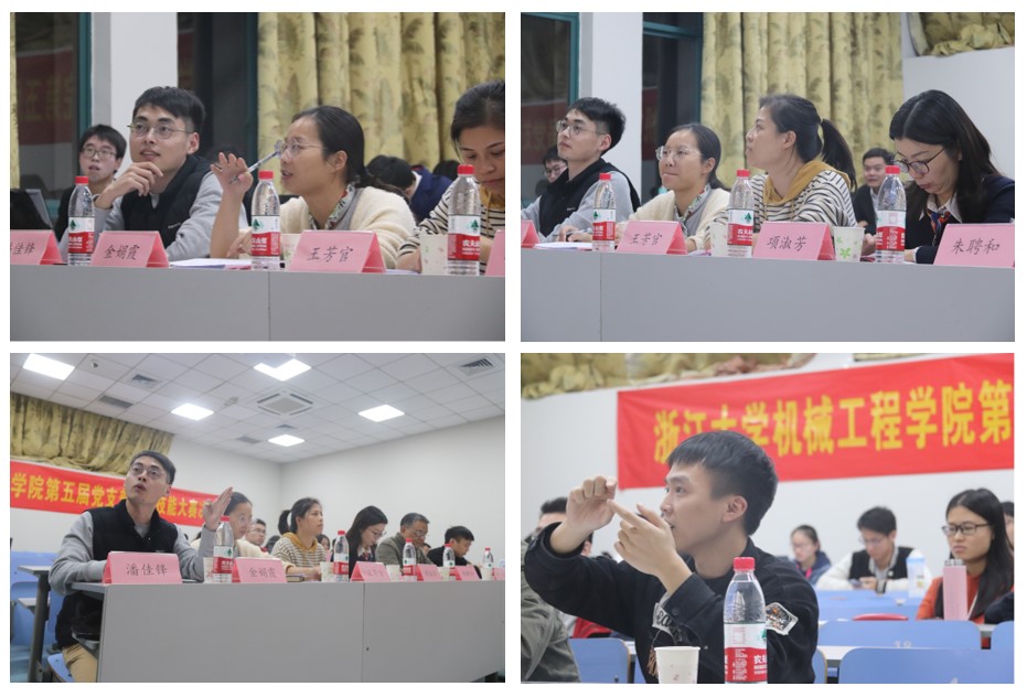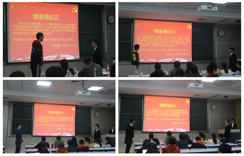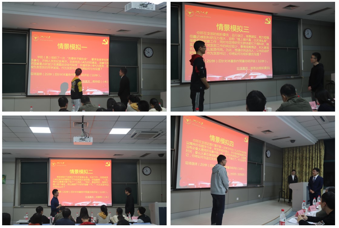 决赛如期于2019年11月14日晚在第七教学楼102教室举行,出席本次比赛的评委嘉宾有:院党委副书记项淑芳老师,院教师退休党支部书记朱聘和老师,院团委书记、辅导员王芳官老师,院团委副书记、辅导员金娟霞老师,院学生党员干部代表潘佳锋同志、浙江大学第六届研究生党支部书记素能大赛一等奖得主何权同志。决赛共分为两个环节:组织生活案例展示以及党建实务情景模拟。
