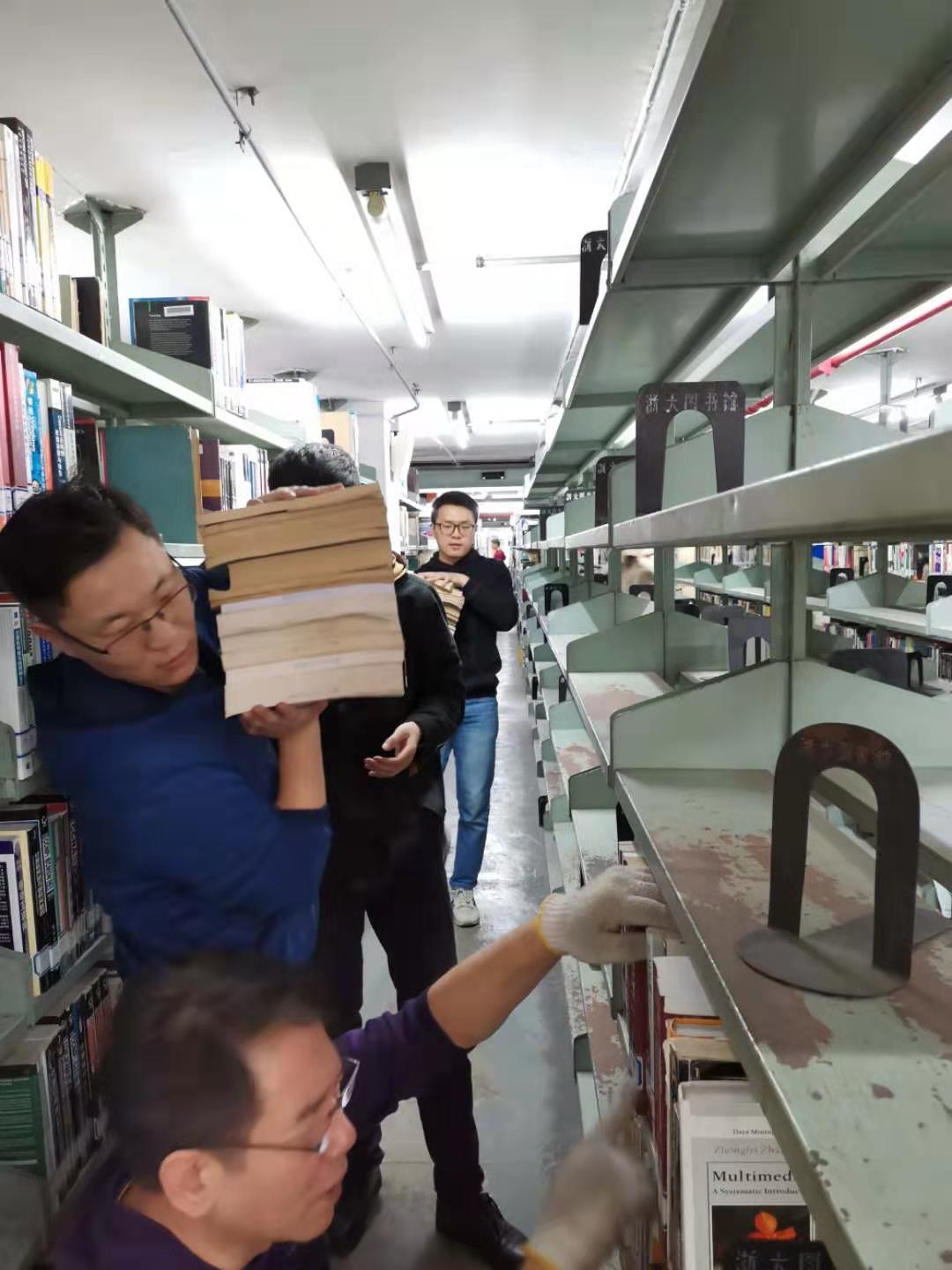 下午两点,支部党员们提前几分钟到达图书馆流通书库,工作人员带领大家进入了玉泉流通书库的三楼储藏室,此时已经有几位老师在忙碌了。按照工作人员的指导,大家将一册册图书重新上架,并将未完成分类的图书摆放至待上架区域。虽说天气阴冷,但工作一小时下来,不少同志脸上也泛出了小汗珠。