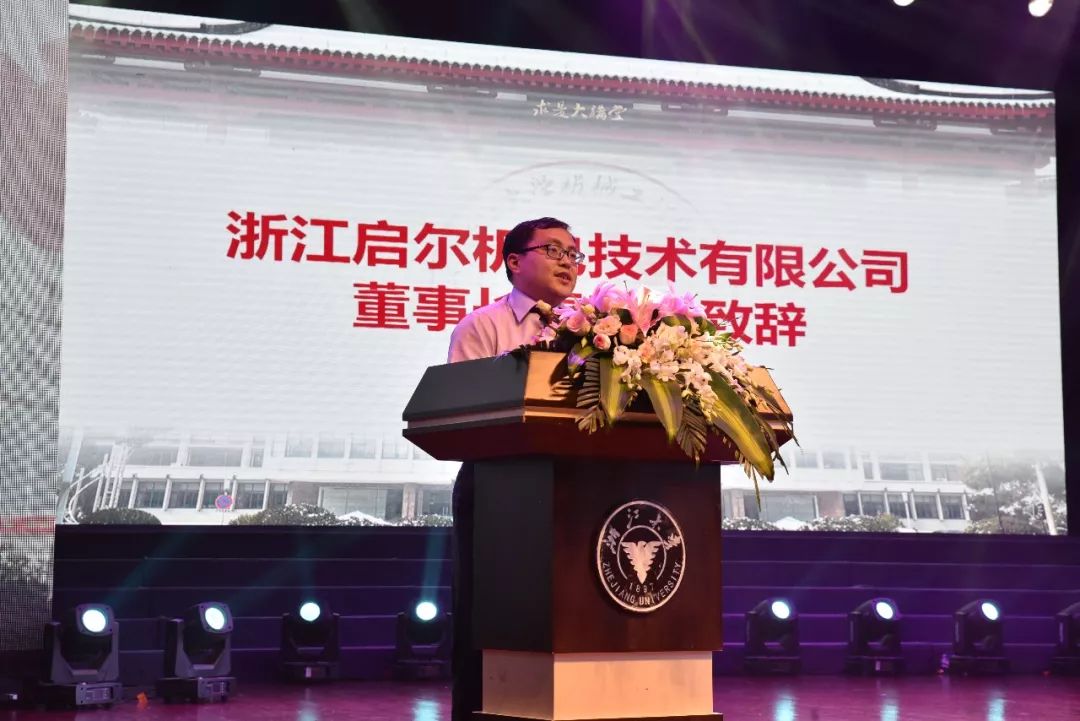作为本届风采月暨机械学院毕业晚会的赞助商,来自浙江启尔机电技术有限公司董事长雷万里先生致辞。他说“启尔”二字来自浙大校歌歌词“实启尔求真”,象征着启尔机电和浙大血脉相承。回顾了启尔机电与机械学院的友好合作,他希望在今后的合作中能够继续取得丰硕的成果!机械学院与启尔机电在多个方面都有密切的合作,有效的推进了科研机构与企业的产学研相结合,使科研贴近市场需求,提高了产品转化效率。此外,启尔机电在浙江大学设立了相应的奖学金,资助学生并支持相关研发。闭幕式上,雷万里先生希望未来能够与更多浙大同学交流与合作。