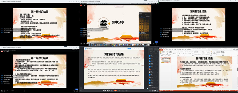 在集中分享环节,每组分别对讨论内容总结分享。在形式上,“直播形式上党课”“会议模式分享心得”;在内容上,“分享自身感悟和周边事迹”“贴近题材,精选高质量素材”“邀请老师等资源开拓”;在组织上,“注重学习材料的前置学习和思考”“增加互动性”等等做法和想法迸发出来,大家感慨是科技发展保证了线上组织生活开展,将不同空间里的大家在同一时间联系起来,也应该利用好这一科技赋予的产物,于是跨支部、跨院系、跨校区,甚至跨高校的组织生活,交叉分享、增进支部间交流的想法得到大家的好评。而网络卡顿成为阻碍线上组织生活进行的首要问题,会前熟悉操作、在网络条件较好的地方参会成为线上开展组织生活的大前提。大家头脑风暴,脑洞大开,在交流和互鉴中不断拓宽认识和思路。