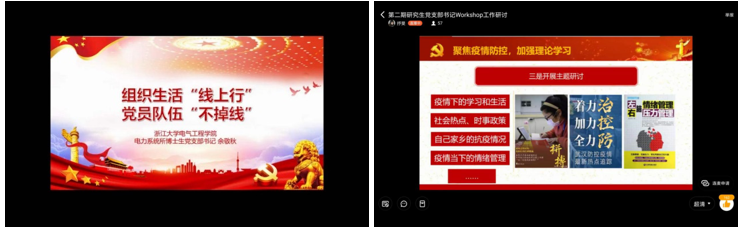 电气工程学院电力系统所博士生党支部书记余敬秋同志关于疫情期间党支部线上组织生活的典型案例分享拉开研讨会的序幕。分享中讲到支部早在疫情爆发阶段,就已经开始开展线上党日活动与理论学习,围绕“聚焦疫情防控、加强理论学习”,“丰富工作形式、细化日常管理”,“落实主题党日、增强党性修养”三方面展开,以浙大、华科、华电三校电气学院学术党支部等几个党支部为例,阐述了如何在疫情下落实主题党日活动。样板支部详实的实际经验为大家指出线上开展组织生活的一种模式的实践,引起大家更多的思考。