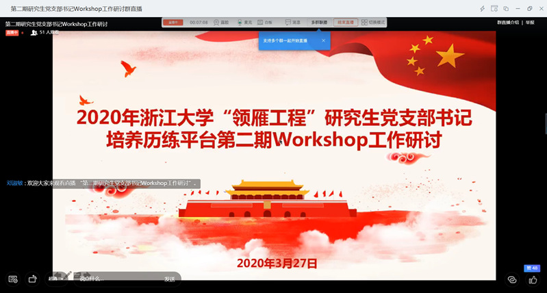 本次workshop聚焦疫情期间党组织生活重点、难点,围绕研讨主题“如何开展好线上党组织生活”展开,创新性利用浙大钉“线上直播+视频会议”双结合方式,开展小而精的交流和研讨。研讨会由计算机科学与技术学院系统结构与网络安全所博士生第三党支部书记邓淑敏同志主持。