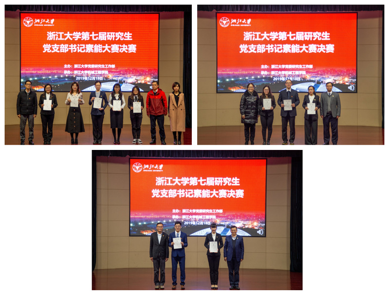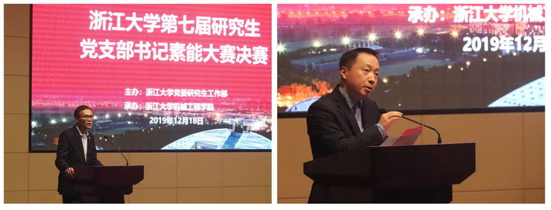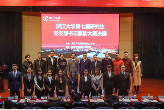 2019年12月18日晚,浙江大学第七届研究生党支部书记素能大赛决赛在浙江大学紫金港校区临水报告厅隆重举行。经过前期集中培训和预赛的激烈角逐,来自10个学院(系)的10位研究生党支部书记脱颖而出进入决赛。浙江大学党委副书记邬小撑、浙江大学纪律检查委员会副书记叶晓萍、浙江大学党委学生工作部部长郭文刚、浙江大学党委研究生工作部部长张荣祥、浙江大学机械工程学院党委书记梅德庆、浙江大学党办校办副主任黄任群、浙江大学党委组织部副处职组织员胡昱东、浙江大学党委宣传部副部长章旻、浙江大学党委统战部副部长钱智敢、浙江大学党委教师工作部副部长陈海荣、浙江大学党委研究生工作部副部长张晓洁、浙江大学团委副书记梁艳出席大赛并担任评委。本次大赛还邀请相关学院(系)辅导员担任“情景模拟”环节助演嘉宾,2019年研究生党支部书记培训班的全体学员观摩了比赛。