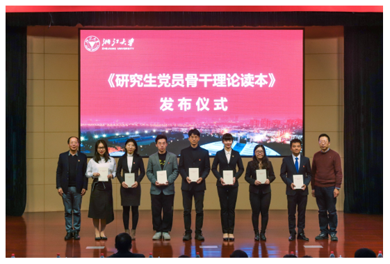 本次决赛举行《研究生党员骨干理论读本》发布仪式环节。《研究生党员骨干理论读本》通过本次比赛正式面世,该书由党委研究生工作部组建、由马克思主义学院专业教师组成的导读专家团队编著,旨在引导广大研究生党员在读原著、学原文、悟原理上下功夫,做到深学深悟、常学常新。胡昱东老师和章旻老师为首批入选“全校党建工作样板支部” 培育创建单位的研究生党支部书记代表颁发读本。