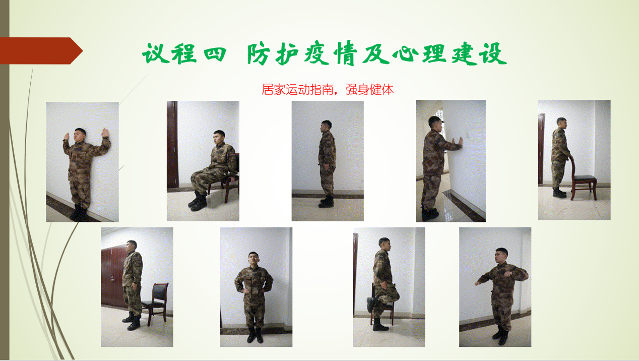 最后,班长张玉城在防护疫情及心理建设方面进行了建议,在帮助同学们正确认识疫情及其相关事项的同时,向大家推荐了一套在家即能做的健身动作,并且希望大家在疫情期间不忘加强身体锻炼以保障身心健康。