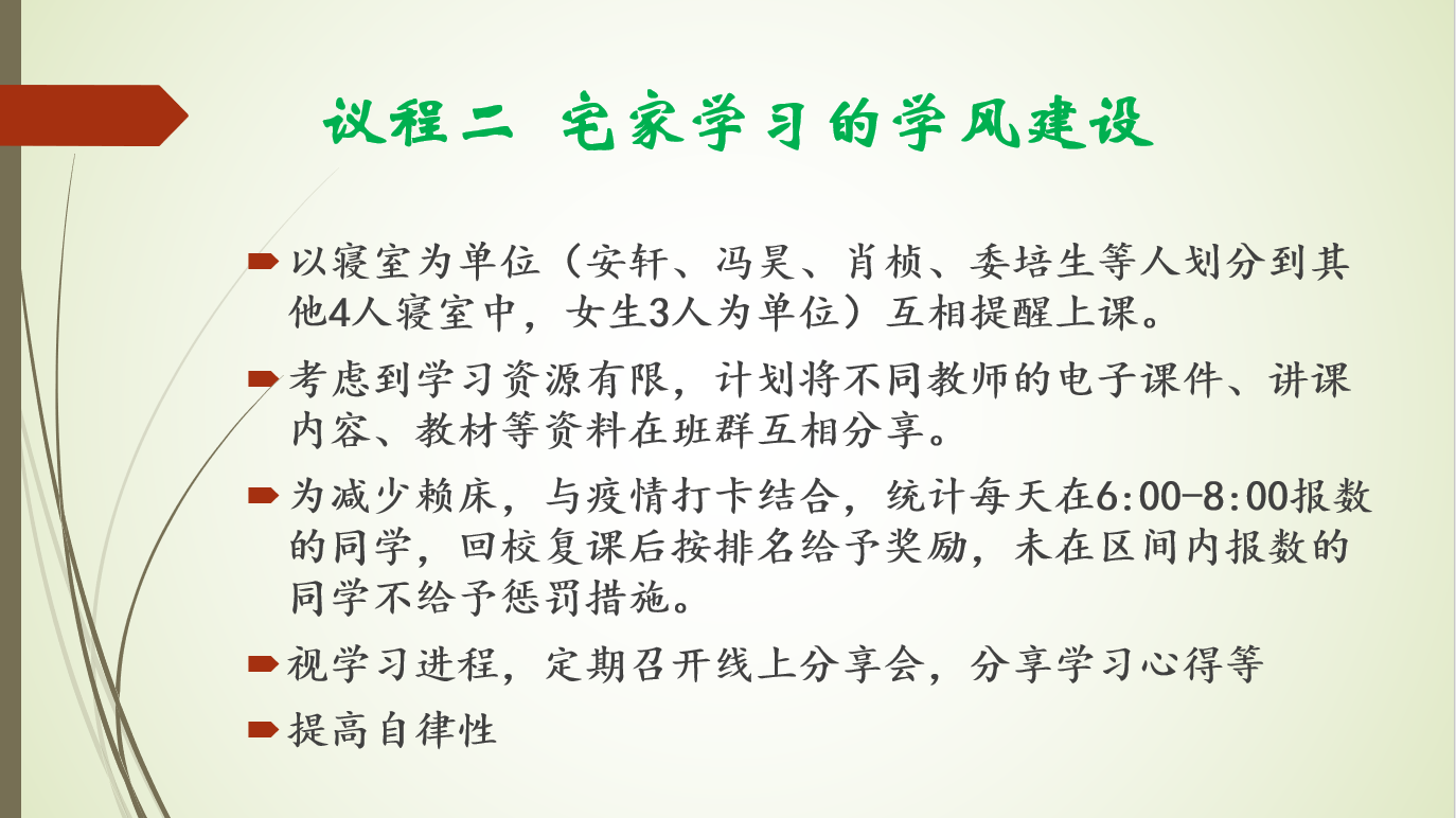 接着,在家学习的学风建设方面,学习委员金杰向大家建议以寝室为单位来相互监督学习,鼓励学习资源共享并通过记录和奖励早晨签到来帮助大家提高自律性与建立良好的学习习惯。