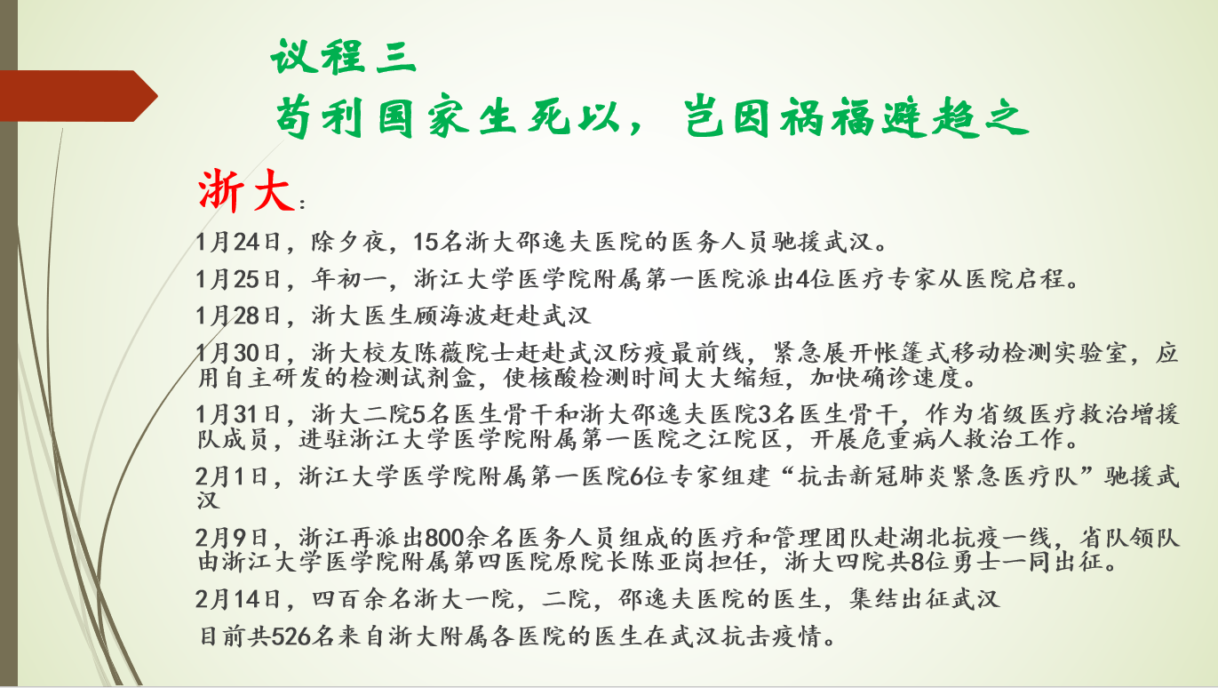随后,团支书韩硕通过学校微信公众号和QQ的官方信息,向同学们展示了浙大医护人员以及机械工程学院在疫情发生期间为抗击疫情所做出的努力,鼓励同学们学习这种“苟利国家生死以,岂因祸福避趋之”的献身精神。