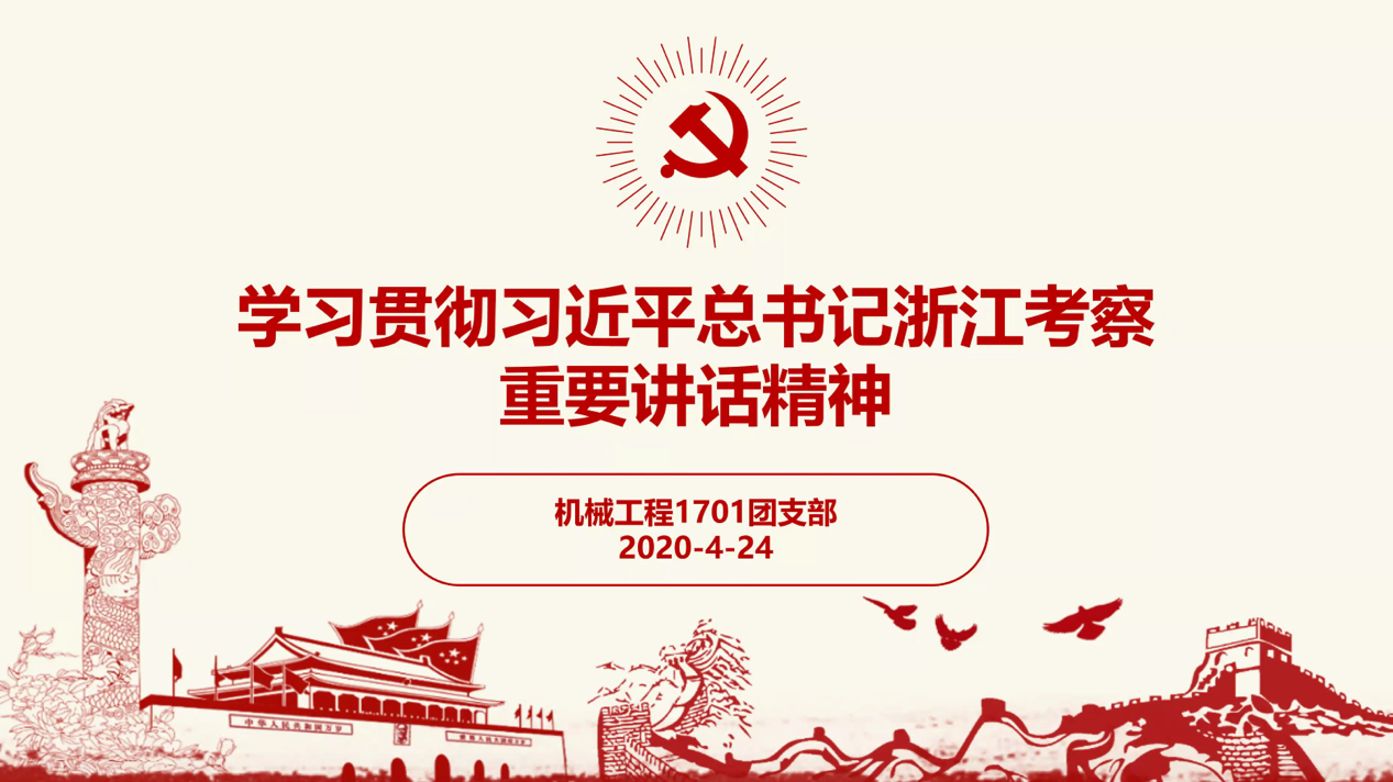 为深入学习贯彻习近平总书记亲临浙江考察时的重要讲话精神,准确把握习近平总书记重要讲话的思想内涵和精神内核,切实做好在战“疫”期间志愿支援、线上学习、返校复学等方面的日程安排和学习规划,机械工程1701团支部二十余人在团支书韩硕的组织下于2020年4月24日开展了以“学习贯彻习近平总书记浙江考察重要讲话精神”为主题的班级线上学习会。学习会期间,团支书韩硕精选了学习总书记讲话精神的相关视频及相关评论文章进行分享与解读,积极地向团员们传达和阐释视频与文章中所包含的总书记讲话精神。