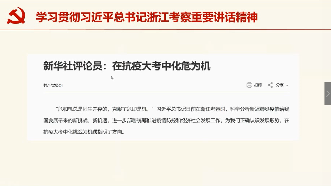 之后,团支书韩硕解读了一篇新华社评论员名为“在抗疫大考中化危为机”的评论文章。文章中谈到习近平总书记在浙江考察时发表了“危和机总是同生并存的,克服了危即时机”的言论,对此,团支书韩硕感慨道“习总书记总是能让我们受到鼓舞的,虽然目前疫情很严峻,世界经济形势也面临着巨大挑战,这是‘危’但这也是‘机’,如果克服了危机,抓住了机遇,变中求新,变中求进,还是能够有所作为的。而着眼于我们自身,也是‘危’‘机’并存,线上授课由于地域等因素导致的网络不通畅一定程度上影响了授课质量,但同时也让我们有机会通过回放的方式进行课程的回顾复习,增进了对知识的理解和多方面的掌握。”