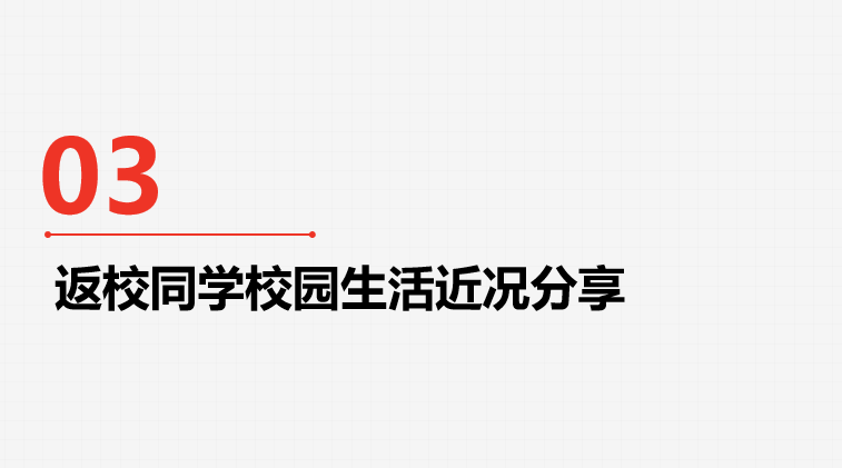 班会第三议程——返校同学生活分享。因本班同学返校人数较少,所以本环节只有徐源同学进行了分享,分享中同学主要谈到的还是返校后的学习情况以及校园内的学习环境,听着徐源同学对于学校防疫措施的肯定以及学习环境的认可,在家学习的同学们也都受到了鼓舞,相信经过本次班会,无论是在校的同学还是仍在家的同学,都会以更加坚定的决心迎接接下来的学习生活。