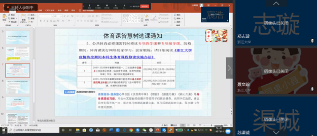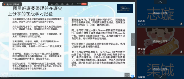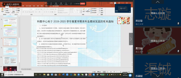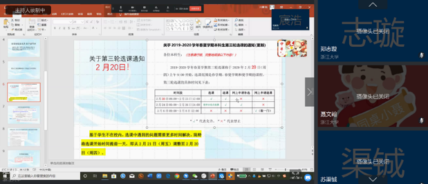 之后团支书详细发布了几个通知:关于第三轮选课的通知;体体育课智慧树选课通知;科教中心关于2019-2020学年春夏学期本科生教材发放的有关通知;补考延迟通知。并叮嘱我们如有需要,则需自行找到通知仔细阅读。介绍完通知后团支书向我们分享了图灵班班委整理并在班会上分享的在线学习经验,并告诉我们一些实用的利于学习的软件,如番茄todo、forest等。