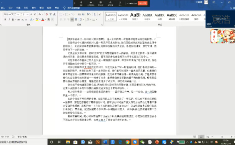 讲完了这些后,团支书带我们观看了抗疫宣传片,并分享了抗疫优秀文章。视频播放了全国各地都在支持疫情防患工作,让这个恐怖疫情不再让人感到害怕。加油中国,加油武汉!文章则从一种崭新的角度讲述了疫情,仔细思考,这次疫情确实让我们原本紧张的生活放松下来,让我们有时间来陪伴自己的父母,来问候那些许久未见的朋友,来与那个他/她静静地坐下来喝一杯咖啡。